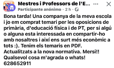 En este caso concreto, se trata de Mireia y Rubén. La historia empieza cuando nos empezáis a mandar capturas de pantalla de grupos de Facebook donde estas personas, con su nombre o en anónimo, publicaban anuncios de venta de temarios. (Os paso uno de sus mensajes en un grupo público).